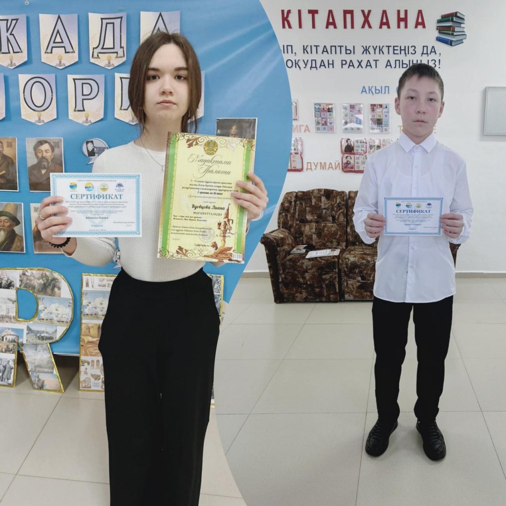 Біздің мектептен екі оқушы Вдовцова Лиана 9 сынып оқушысы, Нұражан Сағынжан 7 сынып оқушысы пән бойынша (орыс тілі және әдебиеті) олимпиаданың аудандық кезеңінен өтіп, облыстық кезеңіне қатысты. Қатысқаны үшін сертификатпен марапатталды. Алдағы уақытта үлкен жетістіктерге жетеді деген үміттеміз#олимпиада